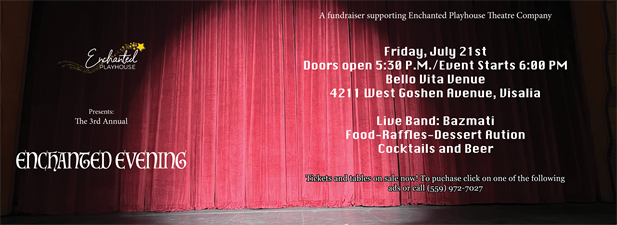 Enchanted Evening is Enchanted Playhouse Theatre Company's annual fundraiser supporting our 2023-2024 season.  Enchanted Playhouse is a non-profit 501(c)(3) family friendly community theatre group who operates out of the Visalia Fox Theatre and Visalia Rawhide at Valley Strong Park.  We host over 5,000 school children annually during our daytime field trip performances.  Many of the children who attend out field trip performances have never seen live theatre before.  The proceeds from this event go towards operations and productions.  Currently, Enchanted Playhouse has the lowest live theatre tickets, $10, in the Central Valley.  We are able to keep our ticket prices so low because of the generosity of our donors at our annual Enchanted Evening Event.