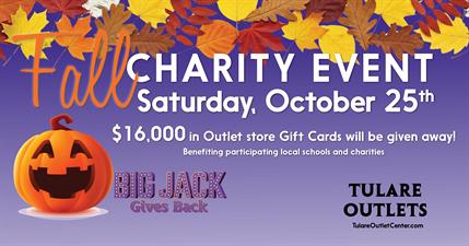 Tulare Outlets presents Big Jack Gives Back—a new version of ‘Barks & Brews.’ This one-day Fall Charity event will benefit participating local charities and schools and will take place on Saturday, October 25, from 10 AM to 4 PM Families can enjoy carnival games, face painting, balloon twisting, character photos, live music, exclusive store discounts, enter to win prizes and the opportunity to win a share of $16,000 in gift cards. Tickets are available to purchase online at TulareOutletCenter.com or in-person and fee-free at Tulare Outlets Customer Service Office, next to Sunglass Hut. Open daily from 8:30am - 5:00pm.