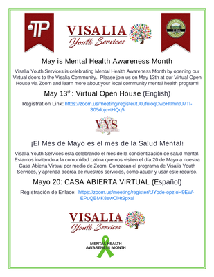 Youth Services is celebrating Mental Health Awareness Month by opening our Virtual doors to the Visalia Community. Please join us on May 13th at our Virtual Open House via Zoom and learn more about your local community mental health program!