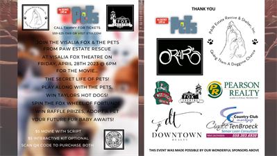 Secret Life of Pets Rated PG/ 86 minutes $5.00 per ticket. We also will be offering Interactive Kits for an additional $5.00 each, for your chance to win Taylor’s Hot Dogs! You can also Spin the Fox Wheel of Fortune to Win Raffle Prizes! AND YOU MIGHT EVEN ADOPT A DOG! Sponsored by PAW Estate Rescue & Shelter, Inc., Taylor’s Hot Dogs, Ridin’ 4 a Reason, Pearson Realty Agriculture Properties, Downtown Realty, Country Club Mortgage – Cindee TenBroeck and the Visalia Fox Theatre. Movie Plot: Max (Konthorn Taecholarn) is a spoiled terrier who enjoys a comfortable life in a New York building until his owner adopts Duke, a giant and unruly canine. During their walk outside, they encounter a group of ferocious alley cats and wind up in a truck that’s bound for the pound. Luckily, a rebellious bunny named Snowball swoops in to save the doggy duo from captivity. In exchange, Snowball demands that Max and Duke join his gang of abandoned pets on a mission against the humans who’ve done them wrong.